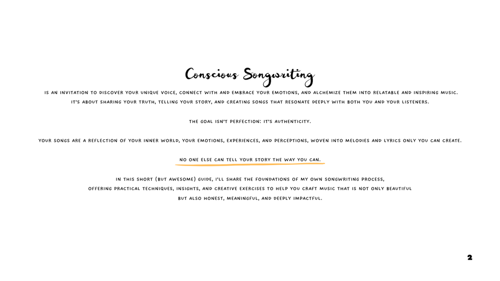 In just 40 pages, this pdf. guide breaks down the basics of my own songwriting process, along with practical techniques, insights, and creative exercises designed to help you craft songs that are not only beautiful but also authentic, meaningful, and impactful.
