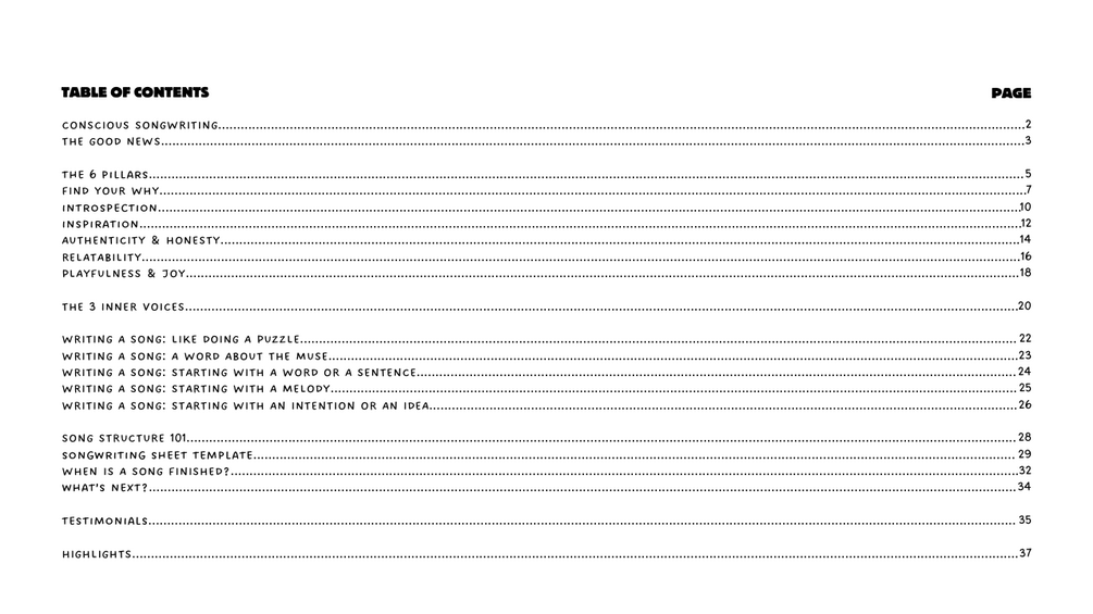You’ll get a complete guide to conscious songwriting, including the 6 pillars of creativity, practical exercises, and proven techniques I’ve used for every song I’ve written since 2008. This guide will help you overcome blocks, find your unique voice, and write songs that feel authentic, meaningful, and deeply connected.